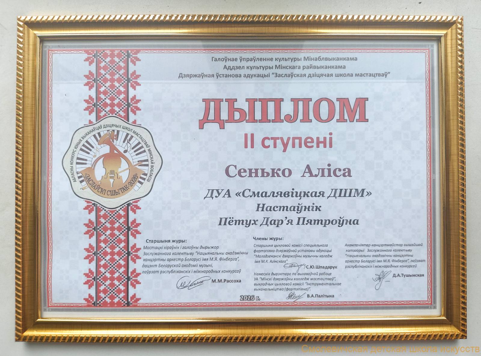 Учащаяся Сенько Алиса (преподаватель Пётух Дарья Петровна) блестяще выступила на конкурсе. Своим талантом, трудолюбием и артистизмом она достойно представила не только нашу школу, но и весь наш район.