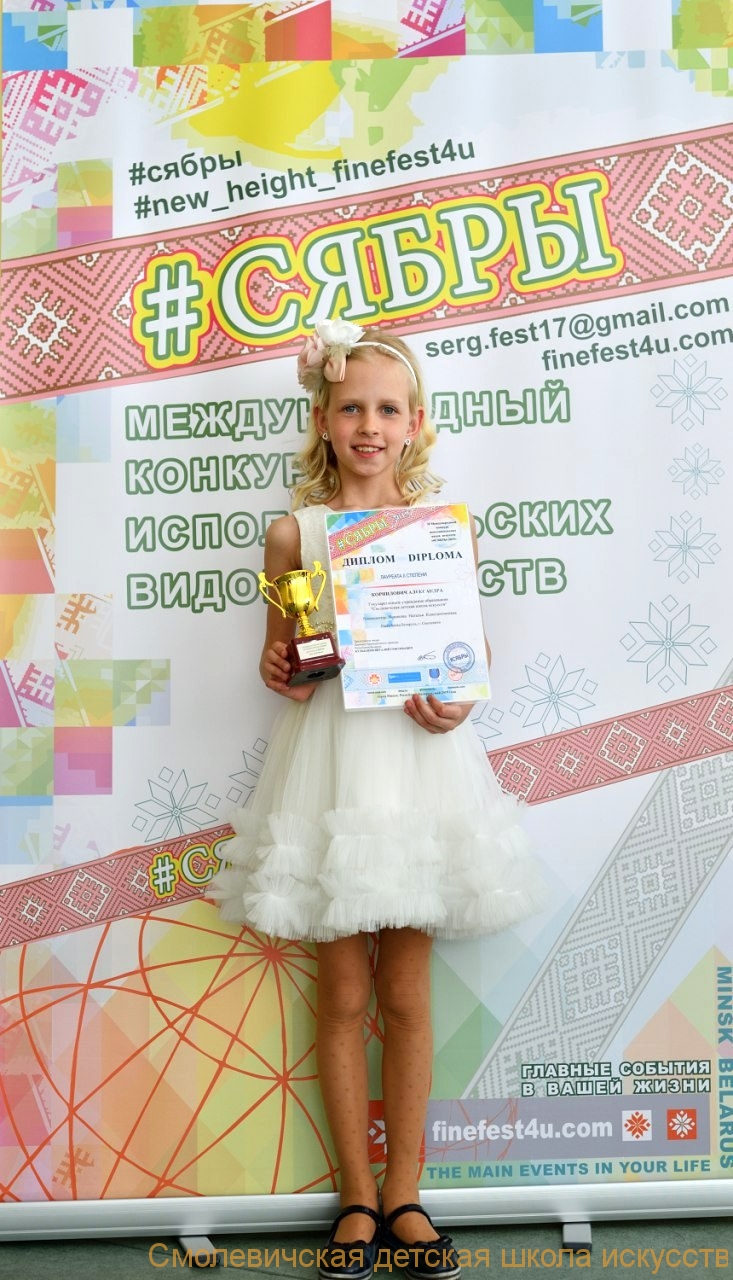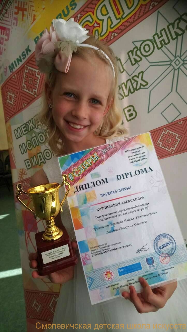 Учащаяся инструментального отделения (фортепиано) ГУО «Смолевичская ДШИ» Корнилович Сандра (учитель Новикова Наталья Константиновна) стала лауреатом І степени этого конкурса. Нужно сказать, что Сандра активно учавствует в различных конкурсах, так 21 апреля 2019 года она стала дипломантом XVI Международного конкурса классической музыки «Viva— music» в городе Рига. Пожелаем дальнейших успехов талантливой ученице и ее учителю!