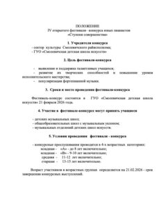 16 Янв 2026 Положение о фестивале- конкурсе пианистов Смолевичи ДШИ 2026 автор art11 | размещено в: Конкурсы | 0 Заявка на участие в фестивале-конкурсе пианистов Смолевичи ДШИ 2026 Скачать «Положение о фестивале- конкурсе пианистов Смолевичи ДШИ 2026» в формате doc